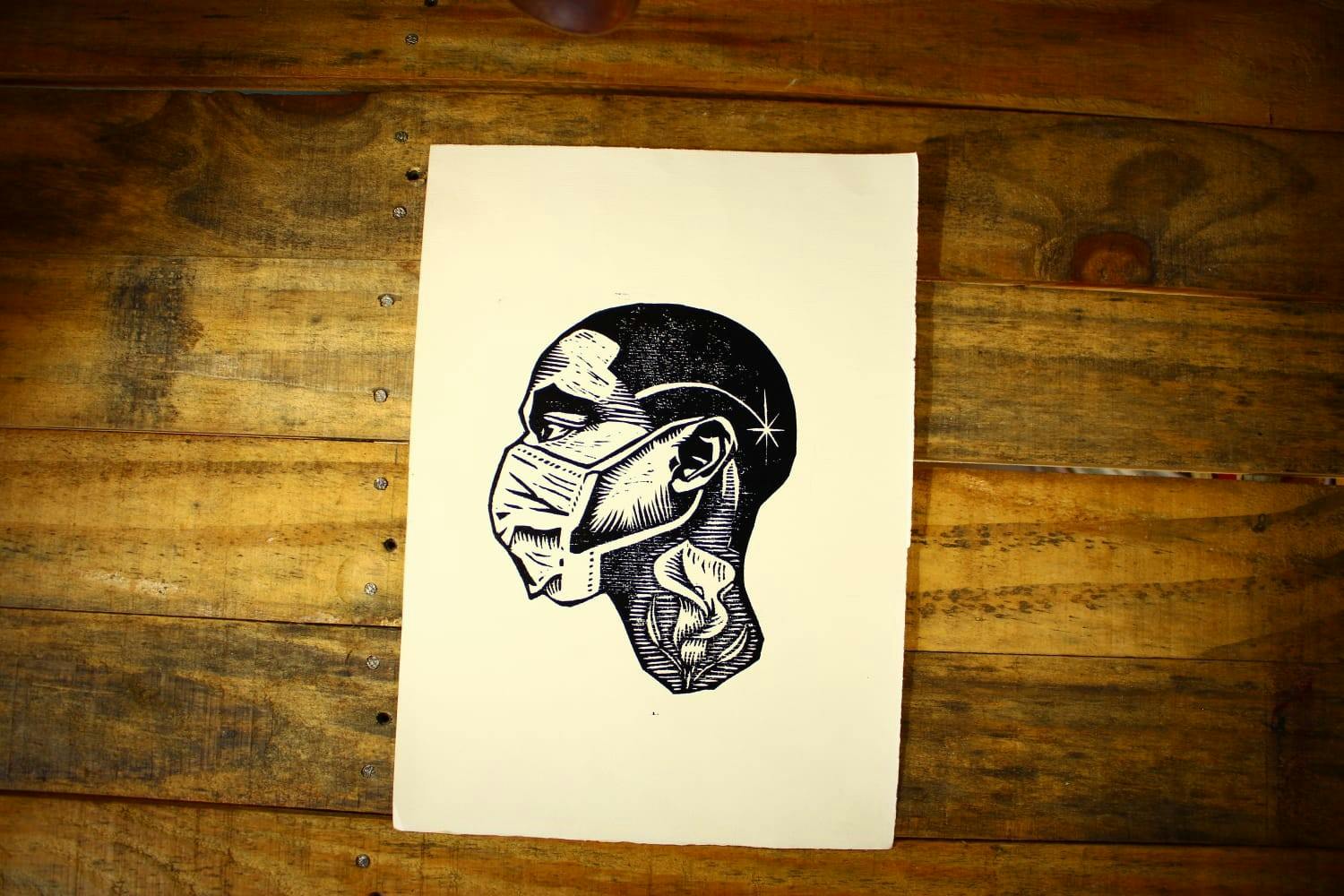 "In 'Preto Blindado,' I draw on my own experience as a Black Brazilian living on the periphery of society to convey the contemporary aesthetics, humanity, and strength of Black Brazilian men. Using xylograph techniques, this side profile of a young man donning a face mask, a razor-edge hairline and designed part, and a calla lily neck tattoo, shows the subtle yet impactful ways in which young men assert their beauty. Presented without pretence or context, this image draws the viewer in and calls one to look and relook, each time noticing a different detail that challenges conventional notions of masculinity."