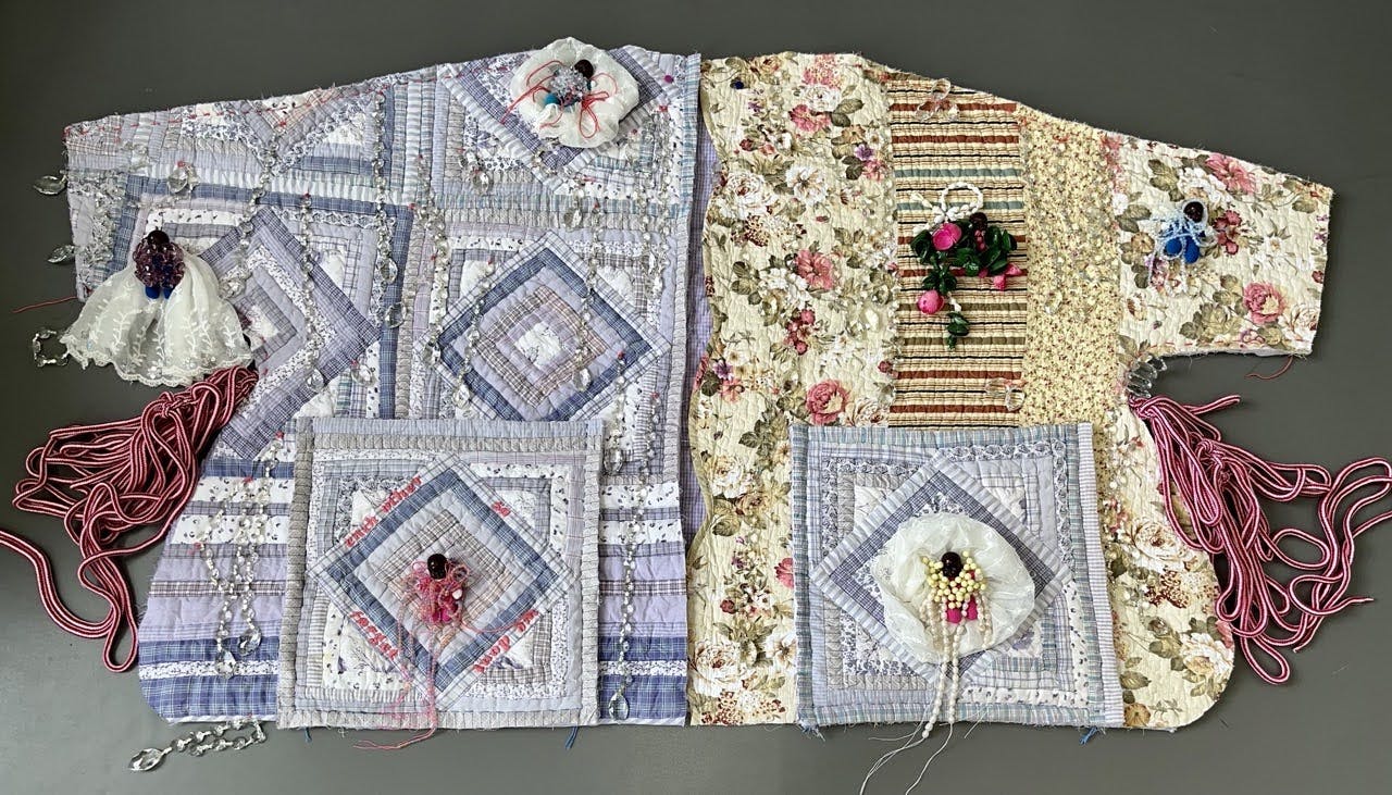"So We Don’t Forget Each Other is a coat sewn by hand and made of found items from my studio and home, particularly quilt remnants, notions, and other bits from previous projects.