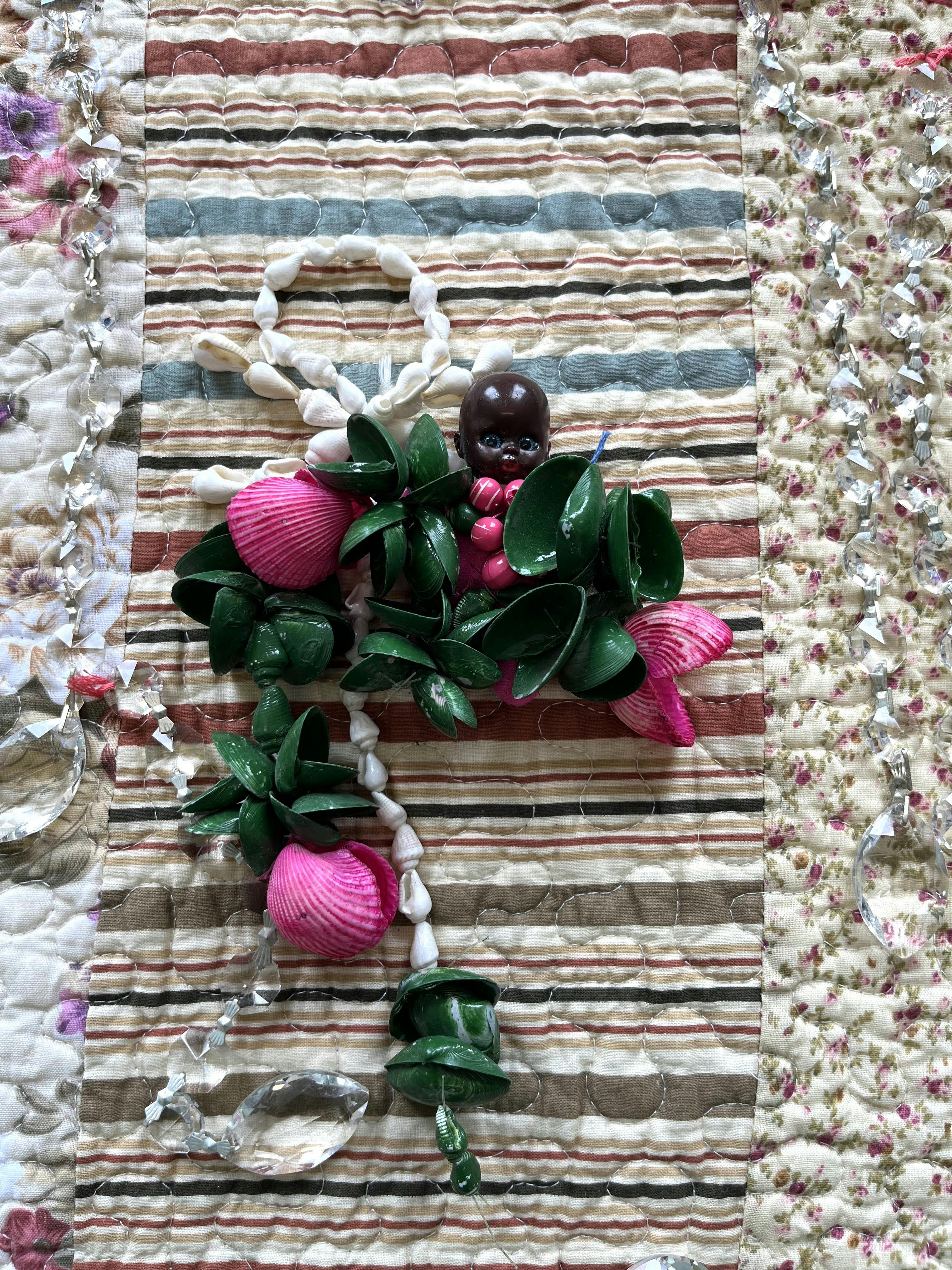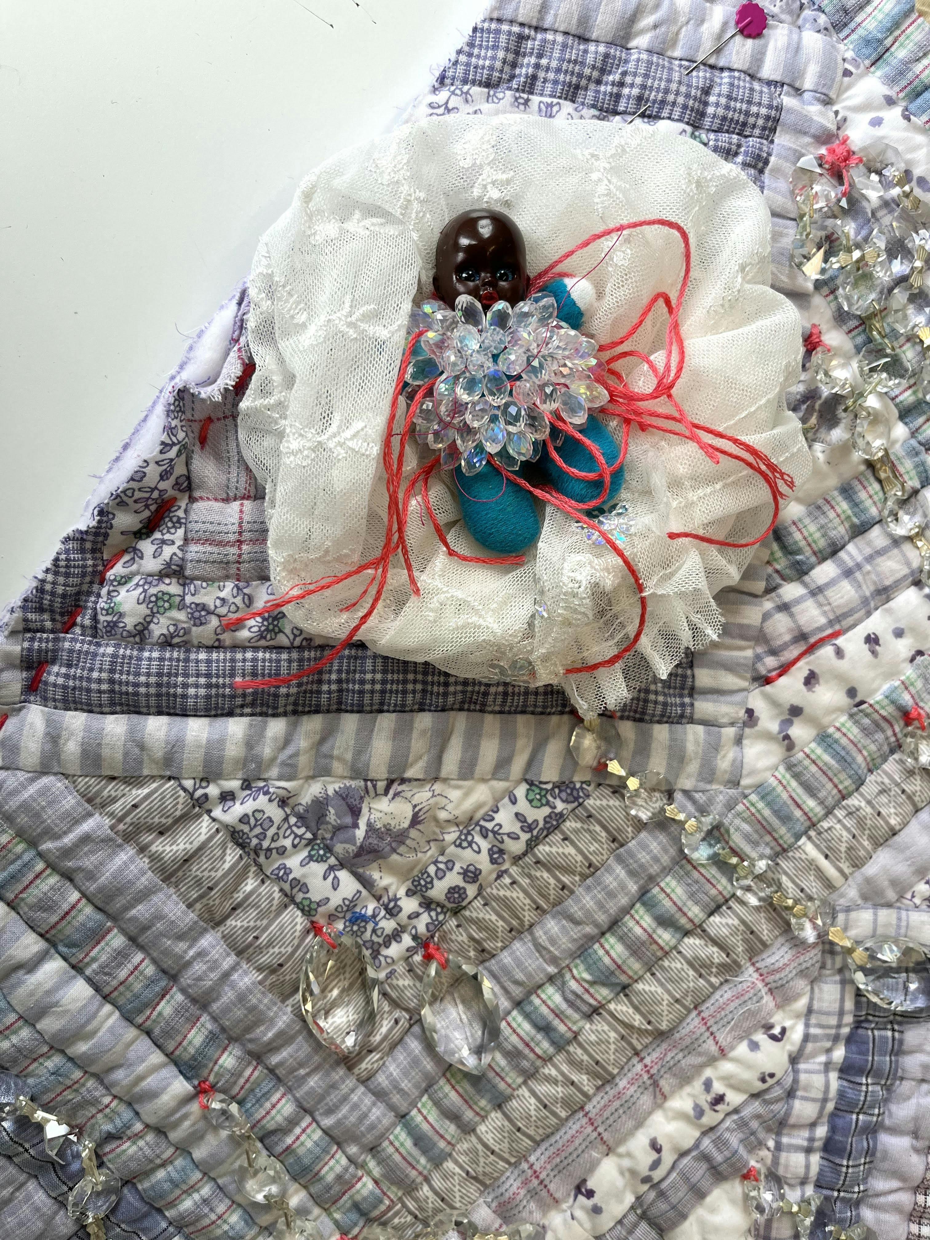 Sequoia Barnes' hand-sewn coat of found items commemorates the late African-American fashion designer Patrick Kelly's gifting of symbolic images of enslavement as a radical, subversive act.