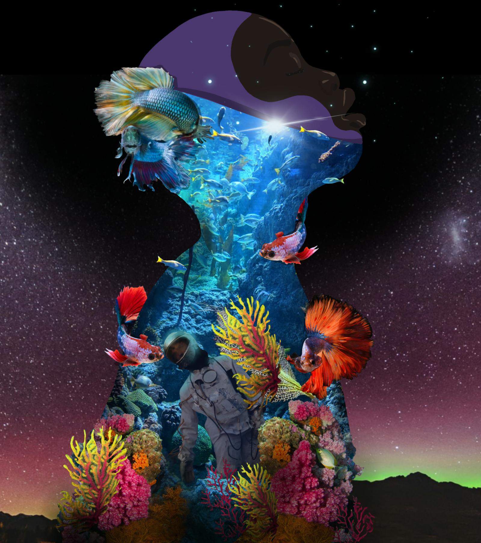 “Worlds Within fuses digitals such as illustrations, photographs and cut-out imagery to tell a story of a search for calm during times of struggle, chaos or anxiousness. It attempts to show how one might seek peace and oneness with oneself and the universe. It is about finding the multiple, surprising worlds within ourselves and the feeling of connectedness that this can bring.”